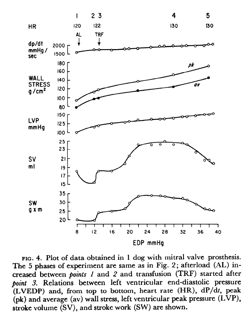 Au début des années 1970, l’équipe de John Ross montre que lorsque le ventricule travaille à un niveau de remplissage diastolique maximal (ce qui est le cas dans l’IC congestive), la performance myocardique est inversement corrélée à la postcharge : plus la pression artérielle systolique augmente, plus l’index cardiaque baisse (article ici et illustration à droite). L’idée fait son chemin qu’un traitement vasodilatateur apporterait un bénéfice aux patients IC, en facilitant le travail cardiaque. Le concept de maladie neurohormonale n’existe pas encore, et les considérations sont purement hémodynamiques. Dérives nitrés et prazosine (alpha bloquant) sont alors utilisés de manière empirique dans les tableaux d’IC décompensée et/ou avancée. Plusieurs études hémodynamiques, au tout début des années 1980, montrent que l’administration d’IEC à des patients IC permet de diminuer la postcharge et d’améliorer l’index cardiaque (cet article par exemple). Milton Packer en 1983 dans le JACC ou Eugen Braunwald dans le NEJM en 1984 (pour ne citer que les plus connus) soutiennent l’idée que les IEC sont les candidats les plus sérieux pour améliorer la prise en charge de cette maladie grave et rapidement mortelle.