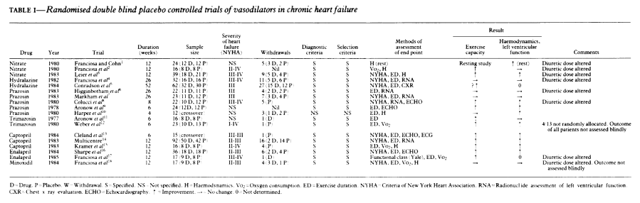 “the combined mortality rate data from the trials of the angiotensin converting enzyme inhibitors (4% treated compared with 8% among the control subjects), appear promising and give us hope that pharmacologic treatment of patients with CHF may alter prognosis. […] Moreover, the promising results of the angiotensin converting enzyme inhibitors have been highlighted over and above other vasodilators after perusing the data (i.e., post-hoc and data derived), and it is possible that the true effects of the angiotensin converting enzyme inhibitors when evaluated in an adequately sized study may turn out to be more modest, although still worthwhile. These currently available results should only provide us with a hypothesis that angiotensin converting enzyme inhibitors may reduce mortality, and this must be tested in future studies. In this context, it may be noteworthy that the angiotensin converting enzyme inhibitors, unlike the many other direct-acting vasodilators, counteract one of the chief underlying neurohumoral mechanisms that mediate vasoconstriction and may be theoretically more advantageous”.