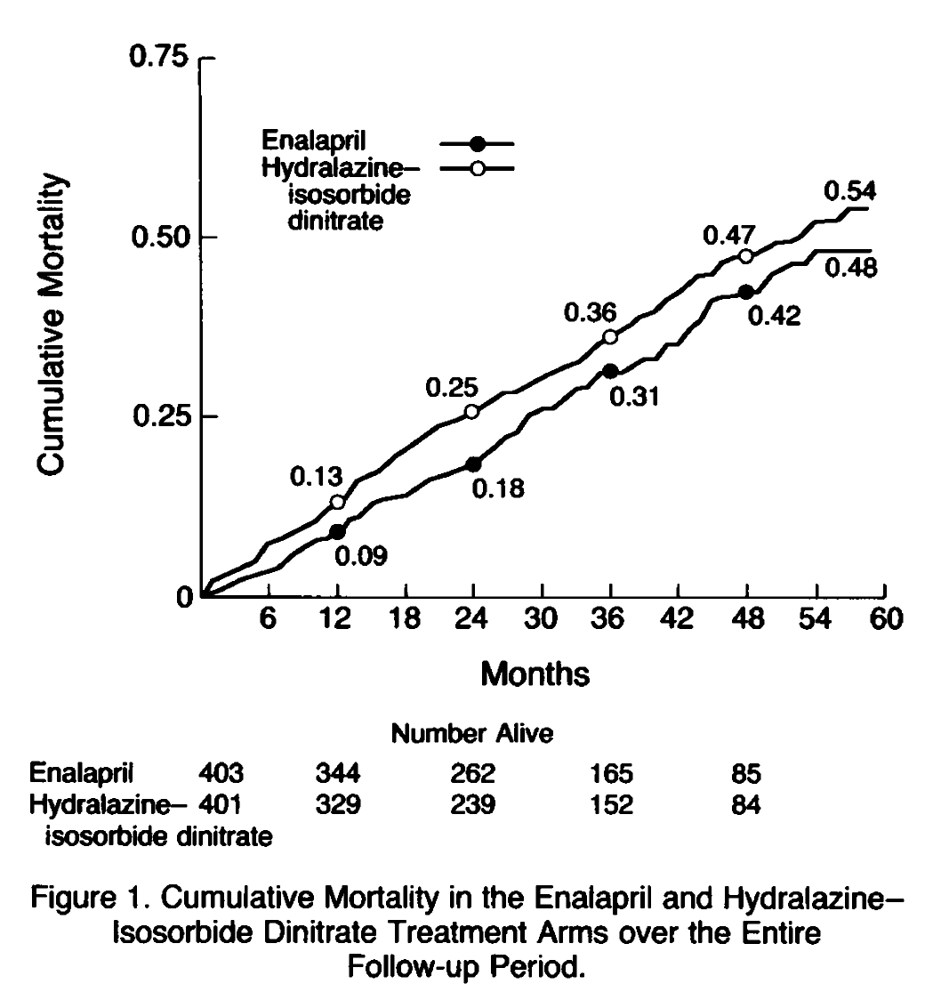Mais l’histoire des traitement vasodilatateurs dans l’IC à FEVG altérée aurait pu être différente. En effet, quelques mois avant la publication de CONSENSUS parait, toujours dans le NEJM, l’étude V-HeFT-I menée par l’administration de vétérans américains et initiée en 1980, (et donc bien avant l’émergence des IEC comme candidats sérieux au titre de traitement de l’IC) comparant la prazosine d’une part, l’association isosorbide dinitrate et hydralazine d’autre part, à un groupe placebo. Le critère primaire, la mortalité totale, survient chez 44% des patients du groupe placebo, 49% des patients du groupe prazosine, et 39 % du groupe isosorbide dinitrate et hydralazine. Les auteurs réaliseront plusieurs tests statistiques pour juger de la significativité de la baisse de la mortalité dans le groupe isosorbide dinitrate et hydralazine, le p variant entre 0,046 et 0,093…
