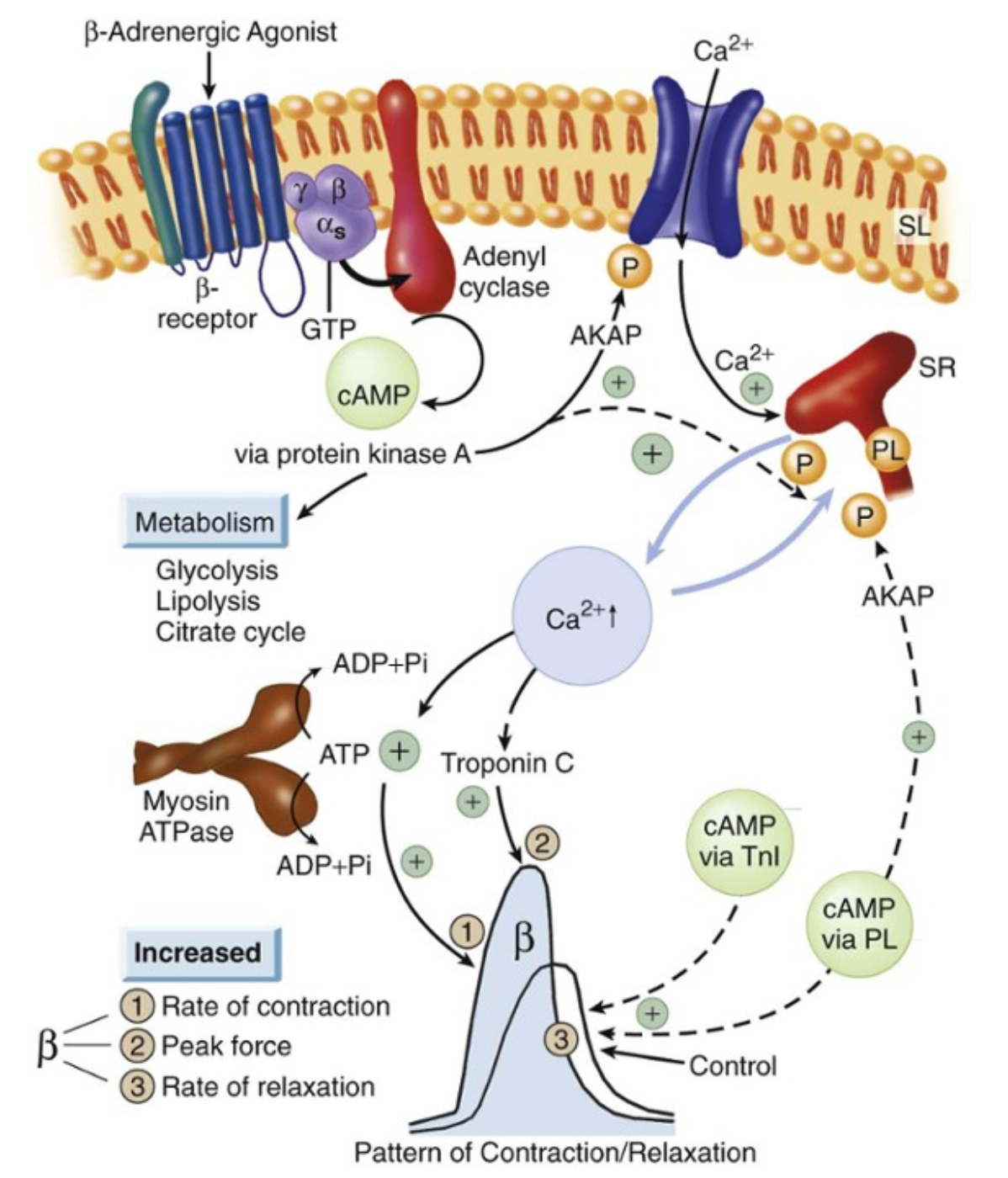 L’activation de l’adenylate-cyclase puis de la protéine kinase A (PKA) va favoriser l’ouverture des canaux calciques et de RyR, et l’entrée de calcium dans le cytosol, facilitant l’augmentation du calcium intracellulaire. Ceci favorise la contraction cardiaque (effet inotrope positif). L’action sur les canaux calciques (via l’adenylate-cyclase ou directement par la protéine Gs) favorise également la dépolarisation cardiomyocytaire et entraine une accélération du rythme cardiaque (effet chronotrope positif). Pour être complet, la PKA va également phosphoryler le phospholamban, ce qui le rend inactif ; cette inactivation empêche l’inhibition de SERCA et entraine une meilleure recapture du calcium, améliorant la relaxation ventriculaire (effet lusitrope positif).