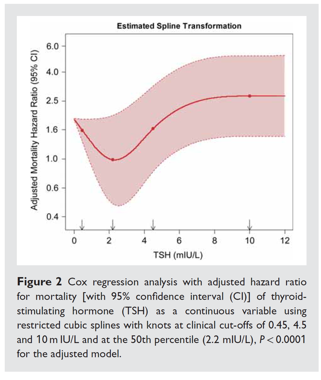 Dans une étude de cohorte portant sur 5.599 patients, Chen et al ont montré qu’une hyperthyroïdie (définie par une TSH inférieure à 0,45 mUI/L) (ce qui ne concernait que 3% de la cohorte) était associée à un surcroit de mortalité, et dans un autre étude de cohorte portant sur plus de 25.000 patients, une TSH inférieure à 0,10 mUI/L était associée à un risque accru d’IC. Plus spécifiquement dans l’IC, dans une analyse ancillaire de l’étude SCD-HF (je reviendrai en détail sur SCD-HF quand je parlerai de l’amiodarone), la présence d’une hyperthyroïdie (définie par une TSH inférieure à 0,3 mUI/l) était associée à une risque accru de mortalité totale de 85 % (HR 1,85 ; 95 CI 1,21 – 2,83). Au passage, dans ces études, l’hypothyroïdie est au moins aussi délétère que l’hyperthyroïdie.