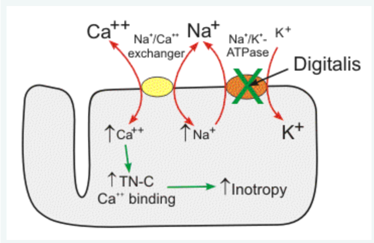 Au niveau cardiomyocytaire, la digoxine agit sur la Na/K-ATPase, qu’elle inhibe. Elle empêche donc la sortie de sodium de la cellule. L’échangeur Sodium/Calcium (bidirectionnel mais faisant, la majorité du temps, entrer du sodium pour faire sortir de calcium selon les gradients de concentration), fonctionne donc moins et la concentration en calcium cytosolique augmente, ce qui explique l’effet inotrope positif de la digoxine.