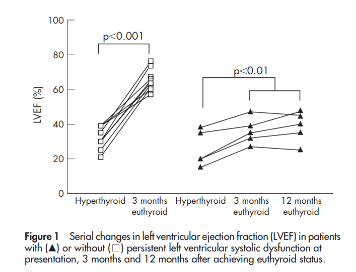 Notons qu’on observe de manière homogène dans les publications, dès l’hyperthyroïdie fruste, une accélération de la FC et une augmentation de la charge en extrasystoles atriales et ventriculaires (voir par exemple ici). Les résultats sur la fonction cardiaque en cas d’hyperthyroïdie fruste sont plus discordants, probablement en raison de cohortes de caractéristiques différentes en terme d’âge, de niveau de TSH et de durée d’évolution.