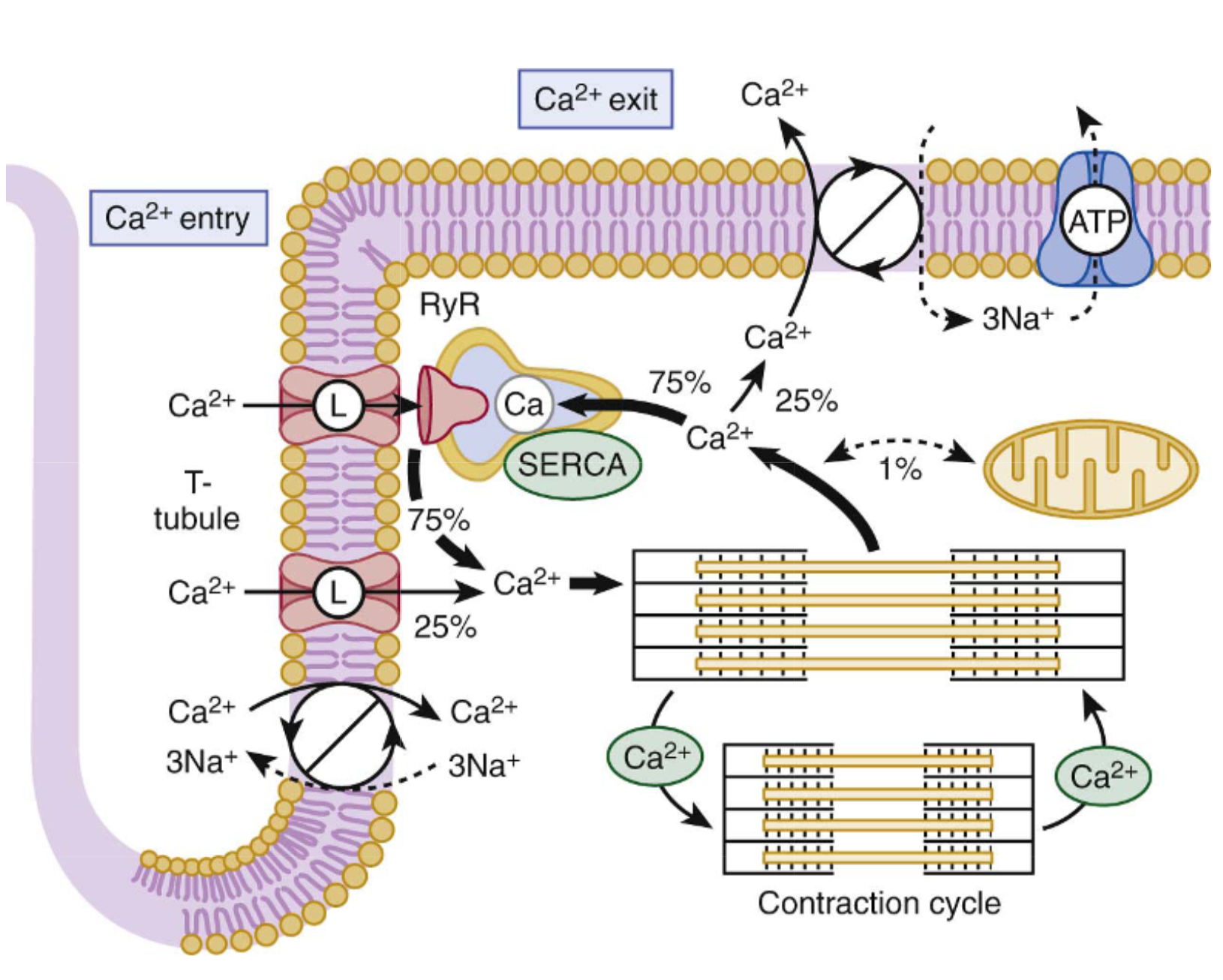 Un élément majeur impliqué dans la contraction est le calcium. Il est stocké en grandes quantités dans le réticulum sarcoplasmique. L’arrivée d’un potentiel d’action va ouvrir des canaux calciques L membranaires, permettant l’entrée de petites quantités de calcium dans le cytosol. Ce calcium va déclencher la sortie du calcium sarcoplasmique, via les récepteurs à la ryanodine (RyR), ce qui va permettre la contraction. Lors de la relaxation, le calcium est recapté dans le réticulum sarcoplasmique par la sarcoendoplasmic reticulum Ca2+-ATPase (SERCA) (ce qui me permet de rappeler que la relaxation du muscle cardiaque est un processus qui consomme de l’énergie…).