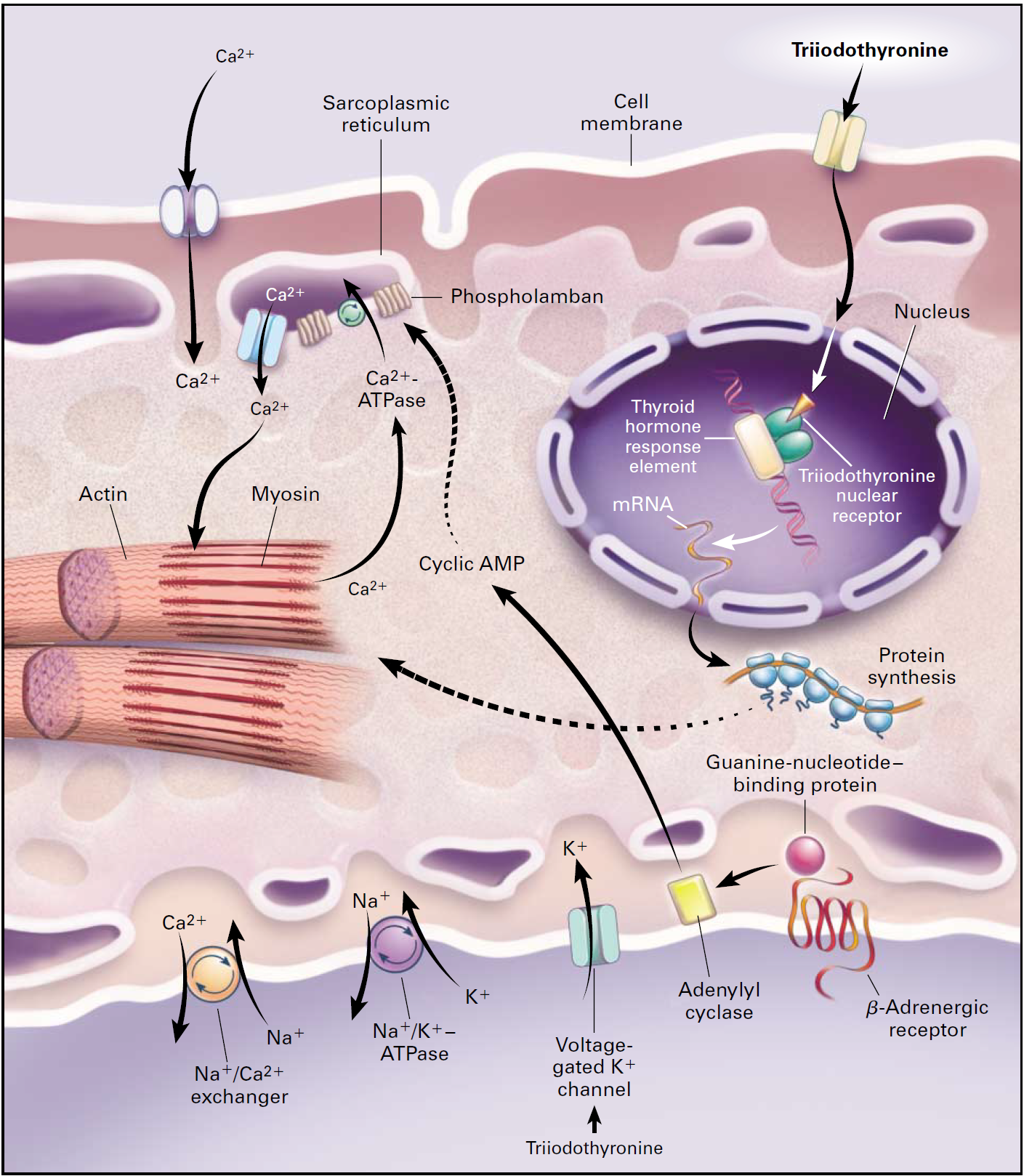 Sous l’effet de l’augmentation de la T3, on observe une augmentation du nombre de récepteurs bêta-adrénergiques, responsable d’une augmentation de la sensibilité à la stimulation adrénergique. Bien qu’il y ait une augmentation des bêta-récepteurs et des protéines Gs, la baisse de l’expression de l’adenylal cyclase entraine un découplage entre la stimulation adrénergique et la réponse contractile, en dépit d’une sensibilité adrénergique globale normale voire augmentée. L’effet inotrope de la T3 est donc indépendant de l’axe adrénergique, et passe par la promotion des chaines alpha de la myosine et par l’augmentation de la concentration du réticulum sarcoplasmique en calcium du fait de l’hyperactivité de SERCA. En revanche, l’absence d’inhibition de la protéine Gs préserve l’action des bêta-récepteurs sur les canaux calciques L, et, de ce fait, sur la fréquence cardiaque (FC), et dans une bien moindre mesure sur l’inotropisme