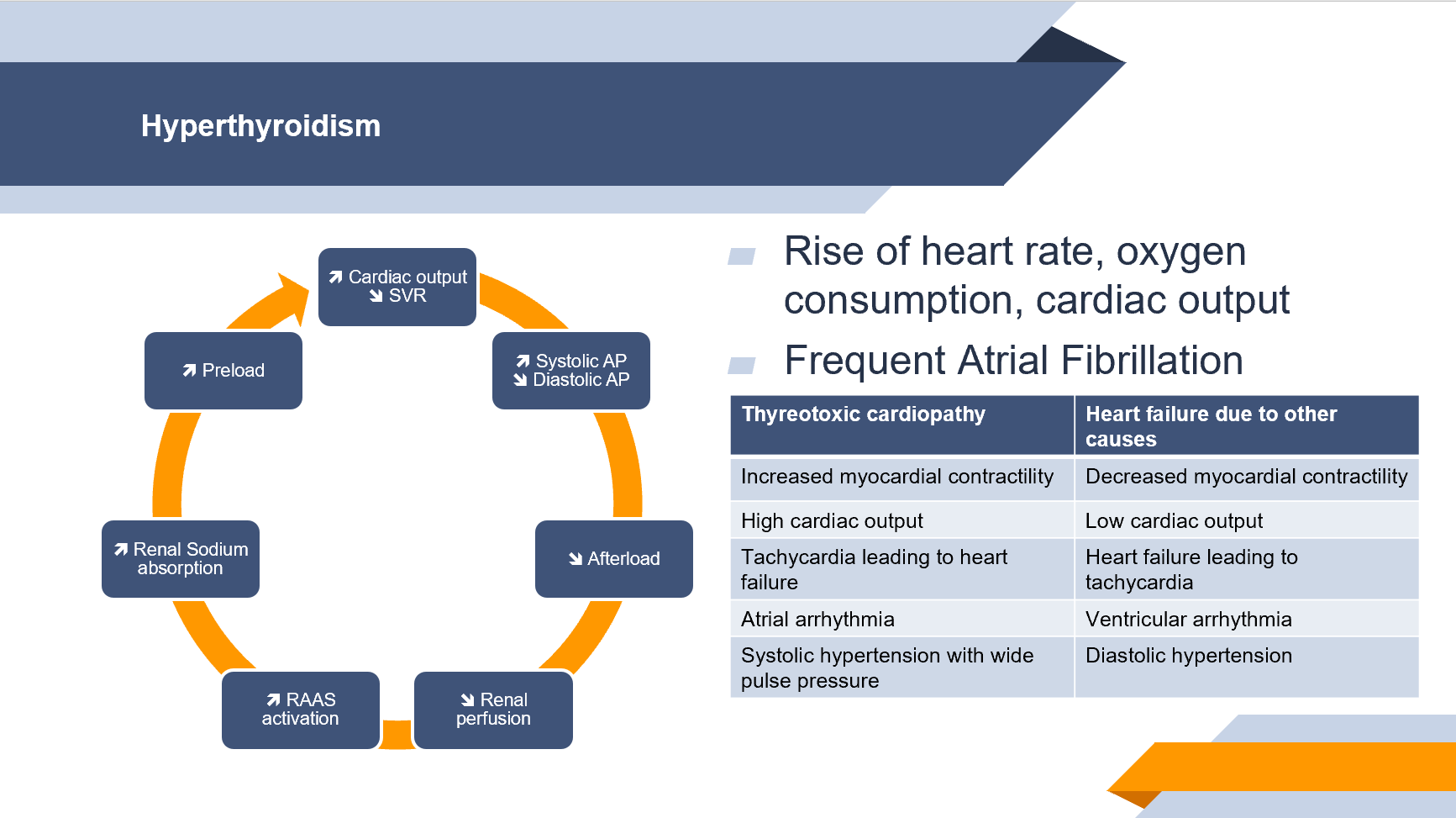 La baisse des résistances périphériques entraine une baisse de la pression artérielle moyenne, responsable d’une baisse de la postcharge ventriculaire gauche, favorisant l’activation du système rénine-angiotensine-aldostérone (SRAA) et donc la réabsorption hydrosodée. En parallèle la T3 favorise l’érythropoïèse et stimule également la synthèse de rénine (voir ici un rappel succinct du fonctionnement du SRAA). L’ensemble de ces phénomènes conduisent à une augmentation du volume sanguin et de la précharge ventriculaire gauche.