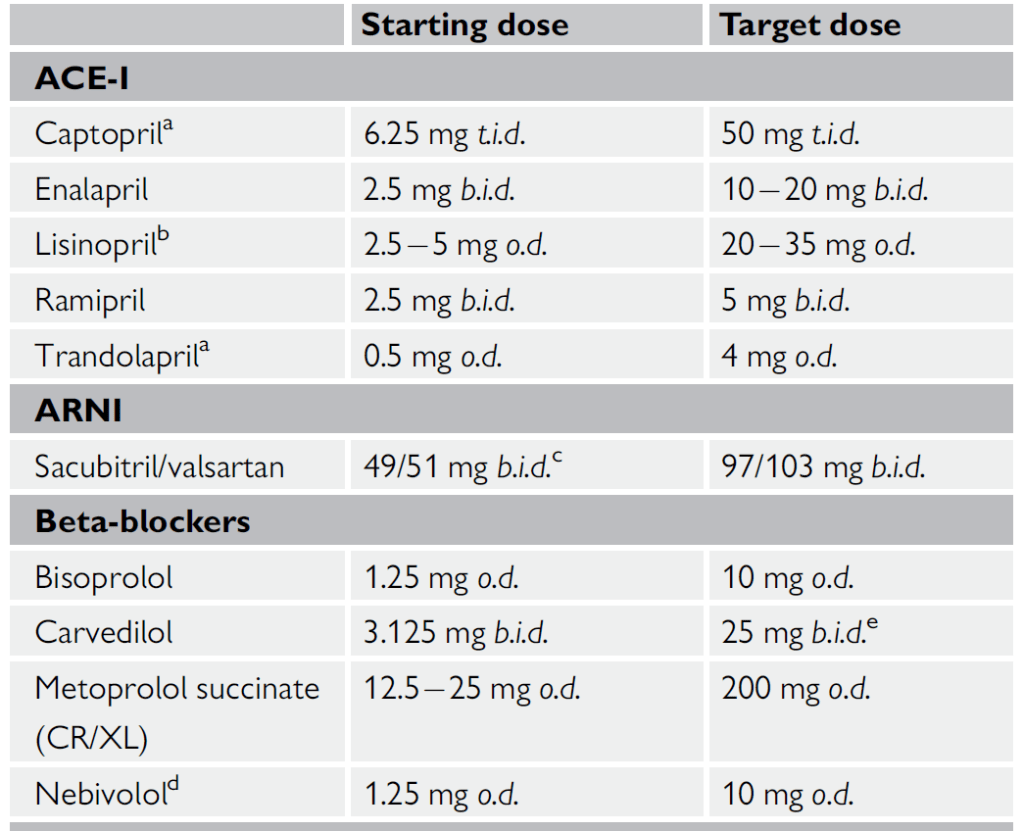 J’attire l’attention du lecteur sur les IEC recommandés pour la prise en charge de l’insuffisance cardiaque (tableau ci-contre). Comme en 2016, le PERINDOPRIL ne fait pas parti des molécules car il n’y a pas d’étude dans cette population, ce dont je parlais déjà en 2019, ainsi que de la limite à apporter à l’usage du LISINOPRIL. De même, seuls 4 bétabloquants fonctionnent dans l’IC à FEVG altérée, et aucun autre ne doit être utilisé. Attention aussi au fait que si le METOPROLOL SUCCINATE fonctionne, le METOPROLOL TARTRATE n’a pas montré d’efficacité (utilisez le SELOZOK et pas le SELOKEN !).