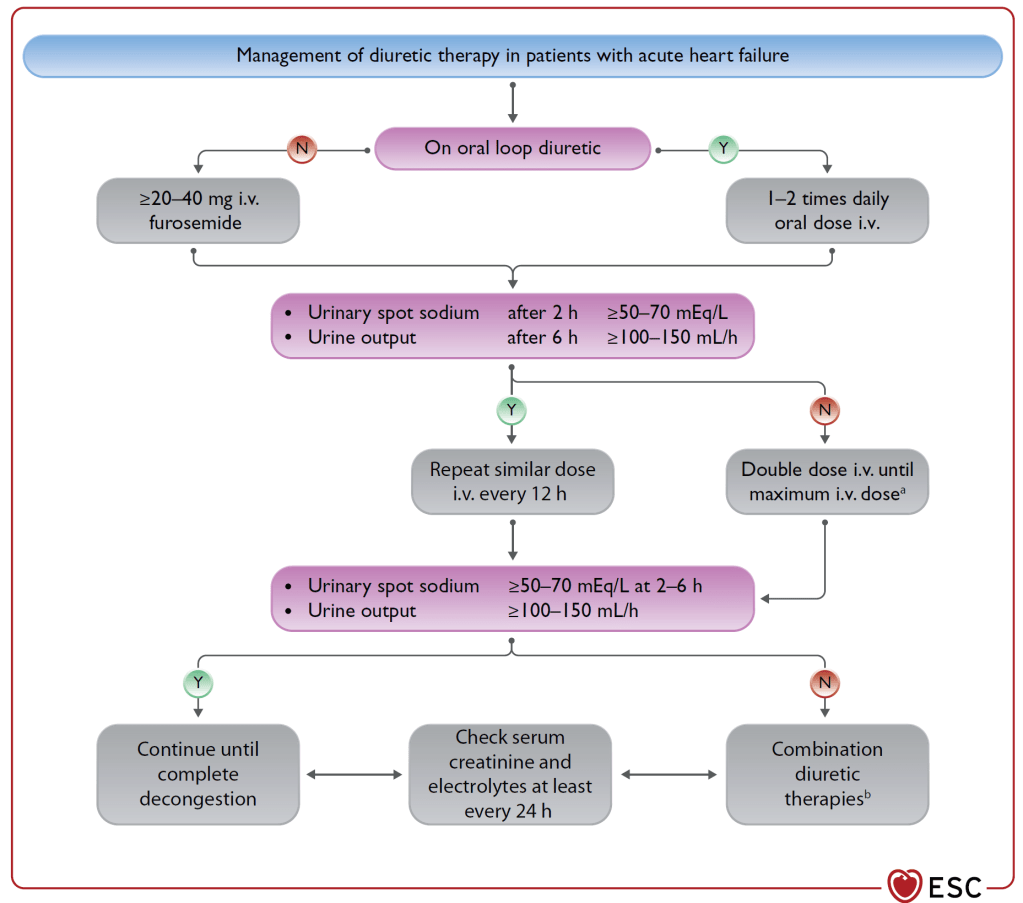 Rien de bien neuf dans ce chapitre non plus. On notera que les opioïdes ne sont plus recommandés pour soulager la dyspnée (recommandation qui m’avait toujours étonné). Un algorithme est proposé pour le traitement diurétique, reprenant les principes d’un papier de consensus publié il y a quelques mois. Les auteurs rappellent l’importance d’optimiser le traitement de fond au cours de l’hospitalisation et de préparer la sortie pour diminuer le risque de réhospitalisation. Il est aussi rappelé de ne pas arrêter les bétabloquants autant que possible (étonnant d’ailleurs que l‘étude B-CONVINCED ne soit pas citée).