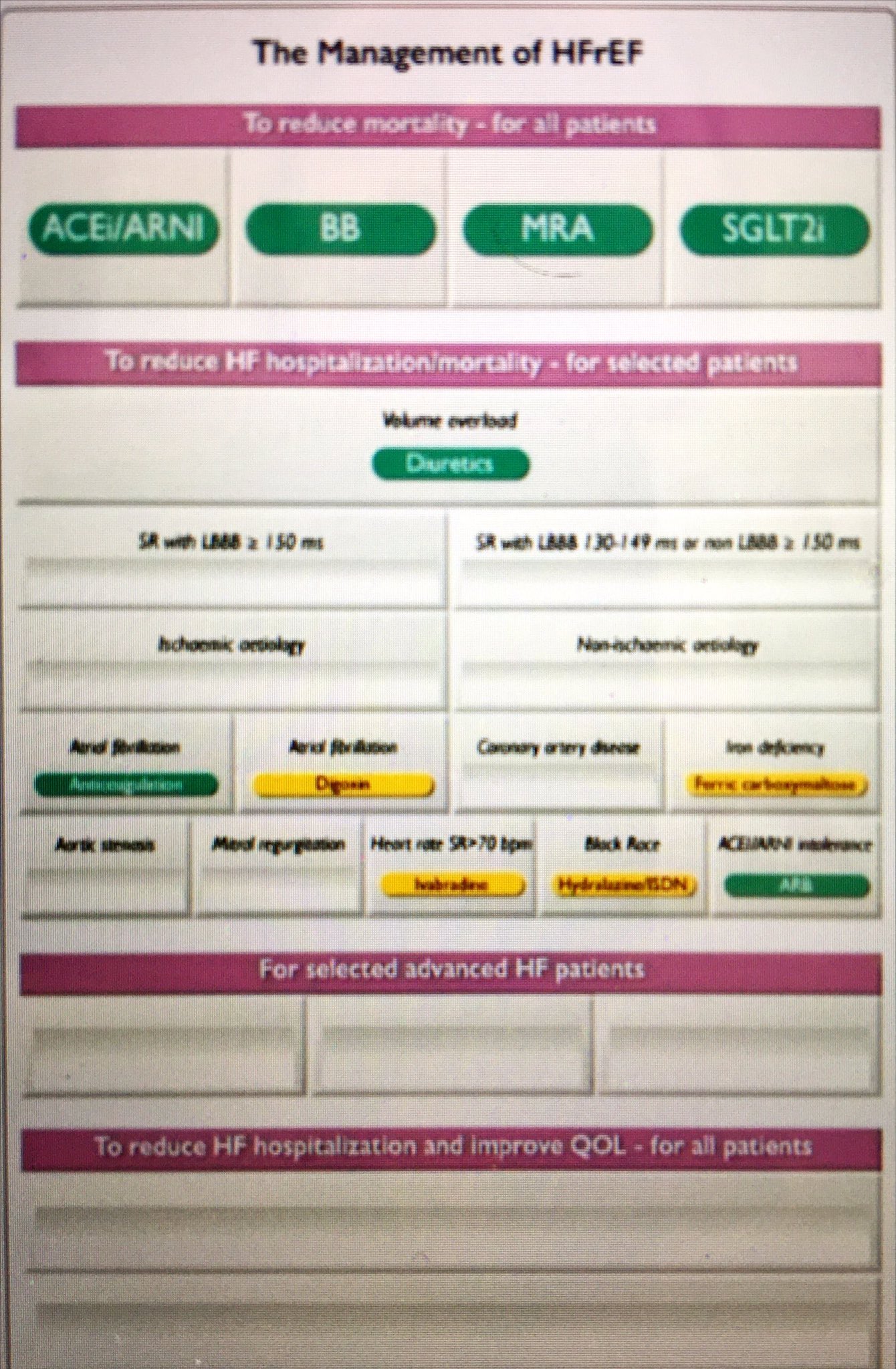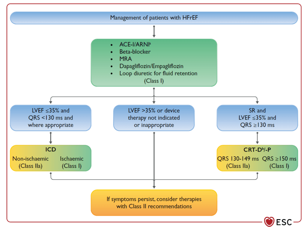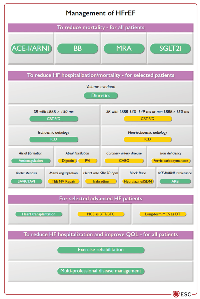 L’une des principales inconnues de ces recommandations était la séquence du traitement pharmacologique de l’IC à FEVG altérée. Les dernières années ont en effet vu la démonstration de l’efficacité des gliflozines et du SACUBITRIL. Nous avons désormais 5 classes ayant démontré une efficacité sur la mortalité : inhibiteur de l’enzyme de conversion (IEC) (ou antagoniste des récepteurs de l’angiotensine 2 (ARA2) en cas d’intolérance), bétabloquant (BB), antagoniste des récepteurs minéralocorticoïdes (ARM), sacubitril/valsartan (S/V) (seul représentant de la famille des angiontensin receptor neprilysin inhibitor – ARNi) et antagoniste du SGLT2 (SGLT2-i). La question était de savoir quel ordre d’initiation de ces traitements serait préconisé. Faut-il associer d’emblée 4 classes thérapeutiques (BB+IEC+ARM+SGLT2-i) ? Faut-il d’emblée utiliser le S/V sans passer par un étape sous IEC (j’ai donné mon avis sur ce sujet ici) ? Faut-il commencer par une association classique BB+IEC+ARM avant de réfléchir à l’étape suivante ? Finalement, et contrairement à ce que j’ai crains, les auteurs suivent les données publiées au cours des dernières années et décennies, et les appels de certains KOL (Key Opinion Leaders) qui voulaient notamment se passer des IEC pour commencer d’emblée par le S/V. La séquence proposée est