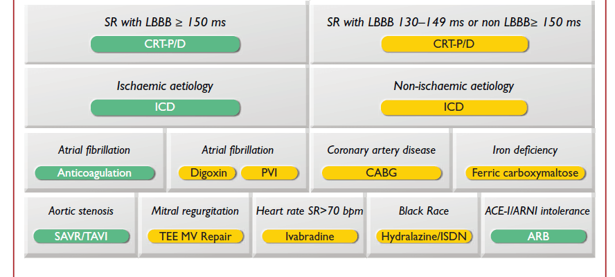 Le chapitre sur les traitements électriques (défibrillateur, pacemaker, resynchronisation) ne contient pas de grande évolution en termes d’indication. Le défibrillateur est indiqué chez les patients symptomatiques avec une FEVG inférieure à 35% après 3 mois de traitement optimal ; le texte néanmoins abaisse à IIa-A (contre I-A) le niveau de recommandation pour les cardiopathies non-ischémiques, en raison des résultats de l’étude DANISH.