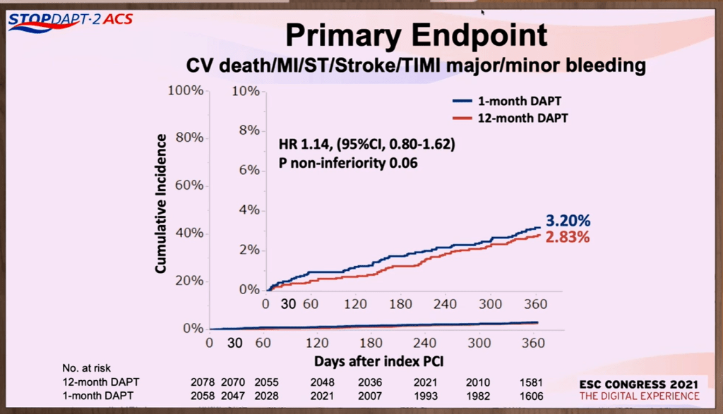 L’étude STOPDAPT-2 (publiée dans le JAMA en 2019) avait montré qu’une double anti-agrégation de très courte durée (1 mois) suivi par une monothérapie par CLOPIDOGREL était non-inférieure à une double anti-agrégation de 12 mois par ASPIRINE et CLOPIDOGREL suivi par de l’ASPIRINE seule, après implantation d’un stent actif dans le cadre de la prise en charge de la maladie coronaire stable, par baisse des saignements plus que par effet sur les évènements ischémiques. STOPDAPT-2 ACS suit le même protocole que STOPDAPT-2, et a inclus dans son analyse les patients ayant présenté un syndrome coronaire de la première étude [l’étude présentée en septembre 2021 à l’ESC a été publiée en mars 2022 dans le JAMA].