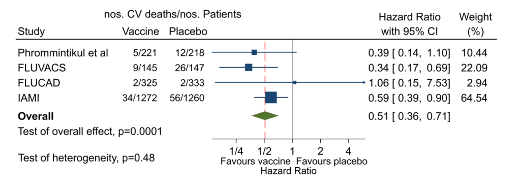 Une méta-analyse de presque 4.000 patients et 4 études (dont IAMI) réalisée par les auteurs confirme les résultats en terme de baisse de la mortalité cardiovasculaire. La vaccination va probablement être proposée systématiquement lors de l’hospitalisation pour infarctus du myocarde.