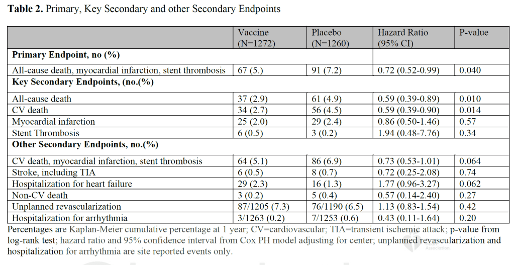 98% des patients recevaient une double anti agrégation plaquettaire et une statine. Le critère primaire est significativement diminué de 28% dans le groupe vaccination (HR 0,72 ; IC95% 0,52 – 0,99 ; P=0,040), baisse peut-être surestimée par l’arrêt prématuré de l’essai. La baisse des évènements est observée chez les patients avec infarctus transmural ou non et dans tous les sous-groupes étudiés, que ce soit pour les décès toutes causes (HR 0,59 ; IC95% 0,39 – 0,89 ; P=0,010) ou cardiovasculaires (HR 0,59 ; IC95% 0,39 – 0,90 ; P=0,014), sans baisse des décès non-cardiovasculaires. Il n’y a pas de baisse des évènements coronaires (infarctus ou resténose intrastent). A part les réactions au site d’injection, il n’y a pas eu d’effets secondaires particuliers.