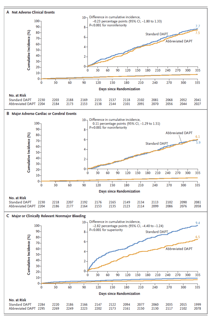 Il s’agit d’une étude de non-infériorité (à lire ici) avec trois critères primaires composites hiérarchisés ayant inclus des patients à haut risque hémorragiques (âgés de plus de 75 ans, sous traitement anticoagulant, hospitalisation pour saignement, etc.). Les patients étaient randomisés 1 mois après l’angioplastie qualifiante s’ils n’avaient pas présenté de complication ischémique ni n’avaient d’hémorragie active. Les patients du groupe « traitement court » arrêtaient alors leur double anti-agrégation pour ne garder qu’un seul anti-agrégant, l’autre groupe poursuivait le double traitement pendant 6 mois. 4.500 patients ont été inclus dont un peu moins de la moitié après un syndrome coronaire aigu. Les deux principales causes de haut risque hémorragique était l’âge et le traitement par anticoagulant. Le risque ischémique était important avec un tiers des patients inclus après syndrome coronaire et des lésions complexes et longues (appendice page 34).
