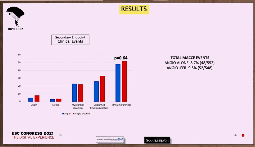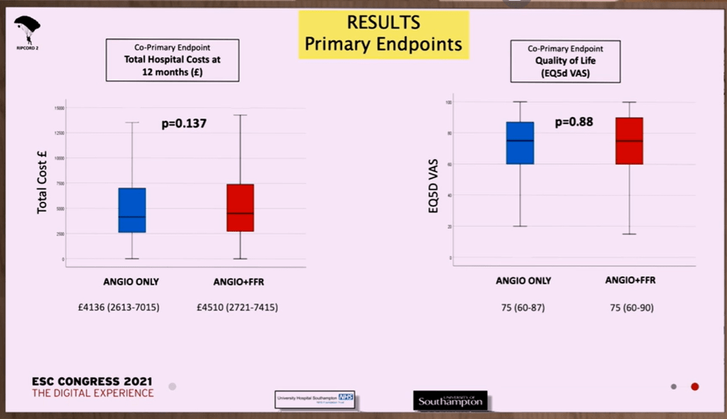 RIPCORD-2 (comme pour STOPDAPT-2 ACS, je n’ai pas trouvé d’article publié – la publication concomitante des articles étant plus fréquente en cas d’étude positive qu’en cas d’étude négative – et je suis donc limité à la présentation faite à l’ESC) [l’article a été publié dans Circulation en août 2022] est un essai randomisé en ouvert, évaluant, chez 1.100 patients avec une maladie coronaire chronique ou un syndrome coronaire aigu sans sus-décalage du segment ST, l’intérêt de la FFR de toute lésion coronaire supérieure à 30%, au moment de la coronarographie, en comparaison de l’angiographie simple, en terme de qualité de vie et d’utilisation des ressources (coûts hospitaliers et ambulatoires exception faite des coûts des médicaments et des visites chez le médecin traitant – ce qui est à mon avis tout à fait discutable). A la discrétion du cardiologue, sur la base des résultats de la FFR et de la coronarographie, les patients étaient affectés à un traitement pharmacologique seul, une angioplastie ou un pontage (ou éventuellement bénéficiaient d’examens supplémentaires avant que ne soit prise la décision). Dans DEFER, FAME et FAME-2, les patients étaient randomisés au moment où on décidait qu’une lésion devait être angioplastiée, et non pas lors de l’angiographie pour savoir si une lésion devait bénéficier d’une prise en charge.