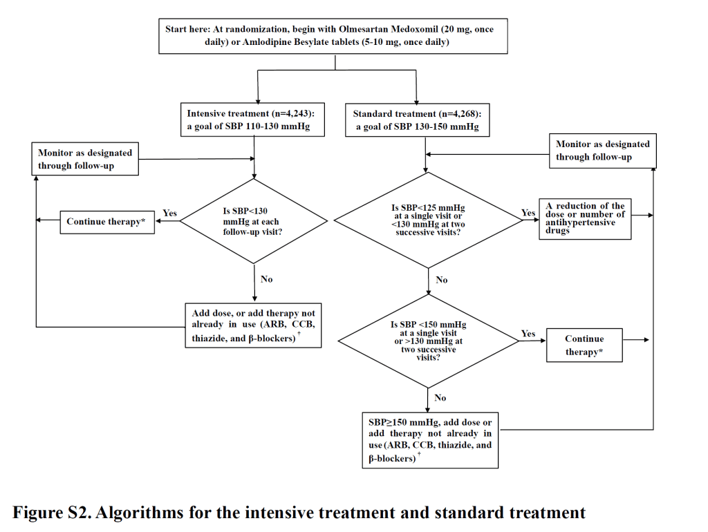 L’étude STEP (Strategy of Blood Pressure Intervention in the Elderly Hypertensive Patients) est une étude randomisée, sans aveugle, ayant inclus 8.511 patients de 60 à 80 ans pour comparer l’efficacité d’une cible tensionnelle à 110-130 mmHg par rapport à une cible à 130-150 mmHg). La PAs moyenne en fin d’étude est de 126,7 mmHg dans le groupe intensif (77% des patients à l’objectif ; 1,9 traitements) et 135,9 mmHg dans le groupe standard (76% des patients à l’objectif ; 1,5 traitements) (contre 146 mmHg initialement). Les patients pouvaient être inclus s’ils avaient une PAs entre 140 à 190 mmHg ou s’ils étaient déjà sous traitement antihypertenseur. Les patients avec antécédents d’AVC (hémorragique ou ischémique) étaient exclus. Les molécules recommandées étaient l’OLMESARTAN, l’AMLODIPINE et l’HYDROCHLOROTHIAZIDE, et le protocole d’adaptation est précisé dans les appendices (voir ci-contre).