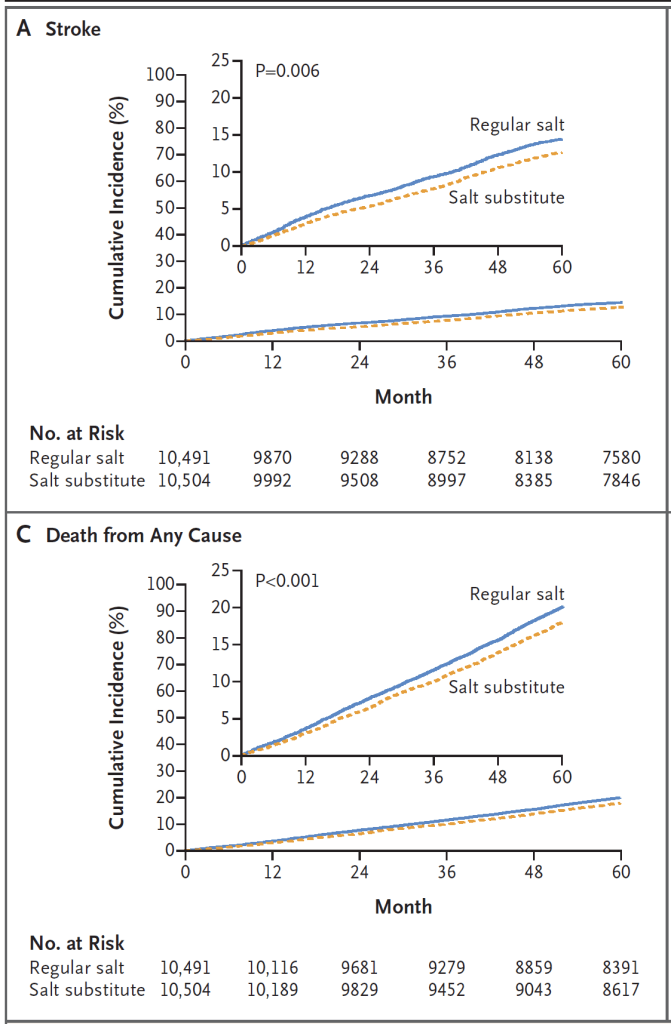 La consommation de sel favorise l’élévation de la pression artérielle et majore le risque d’évènement cardiovasculaire. La diminution des apports sodés est associée à une baisse de la charge tensionnelle de manière dose-dépendante. Néanmoins, aucune étude n’a montré d’efficacité sur les évènements cliniques. L’étude SSaSS (Salt Substitute and Stroke Study) est une étude randomisée en cluster réalisée sur 600 villages en Chine visant à déterminer l’efficacité des « sels de régime » sur la baisse des accidents vasculaires cérébraux. Les sels de régime remplacent une partie du chlorure de sodium par du chlorure de potassium, ce qui peut soulever des interrogations quand au risque d’hyperkaliémie. 35 patients étaient inclus par village, et les villages randomisés entre sel de régime (25% de chlorure de potassium et 75% de chlorure de sodium) ou sel normal. 20.995 patients ayant un antécédent d’AVC ou de plus de 60 ans avec une HTA non maitrisée ont été inclus et suivis pendant 5,1 ans.