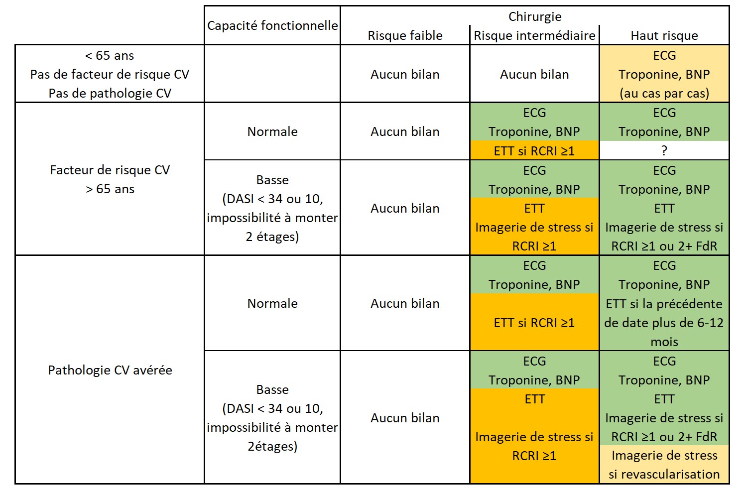 L’évaluation du risque de mortalité et morbidité cardiovasculaire per-opératoire dépend à la fois du risque inhérent à la chirurgie et du risque lié au patient du fait de son état de santé. De l’urgence de la chirurgie dépend ce qu’il sera pertinent de réaliser comme bilan préopératoire.