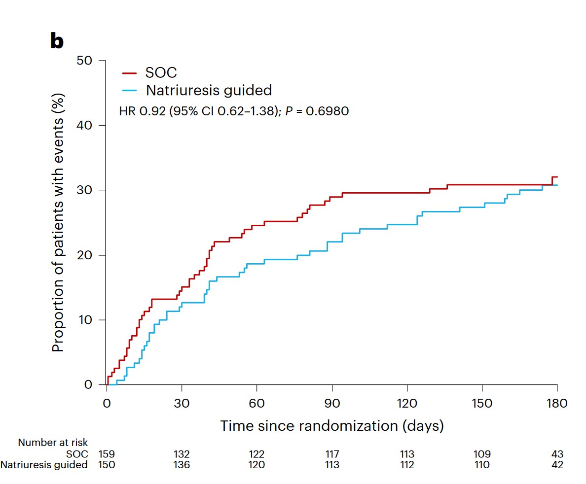 310 patients ont été inclus (âge médian 74 ans, 45% de femmes). Le NT-proBNP médian à l’inclusion est à 4.700 pg/ml, la FEVG de 35%. 57% des patients étaient sous diurétique à domicile, à la dose médiane de 2 mg de bumétanide (je rappelle qu’1 mg de bumetanide équivaut à 40 mg de furosémide) ; 44% des patients étaient pris en charge pour une décompensation cardiaque inaugurale. Dans le groupe « natriurèse », la dose de diurétique de l’anse administrée est supérieure (dose totale 26 mg vs 15 mg de bumetanide, dont 12 mg vs 6 mg dans les premières 24 heures et 16 mg vs 8 mg dans les premières 36 heures) et le recours à un blocage néphronique séquentiel plus fréquent (21% vs 0% dans les premières 24 heures, par HTZ dans l’immense majorité des cas).