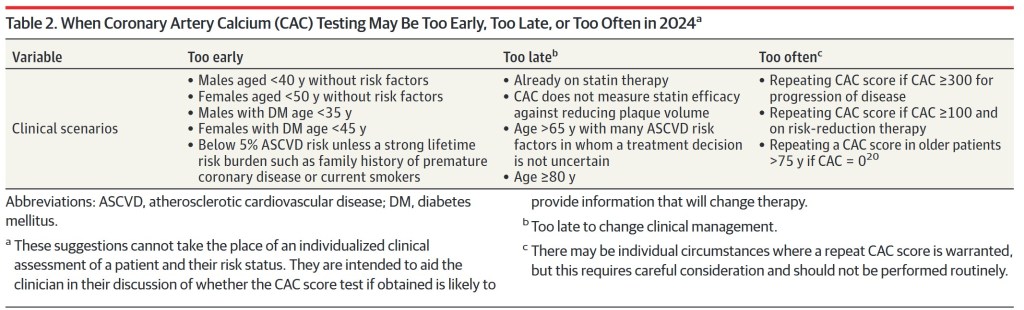 Je peux donc rester dubitatif. Ce n’est pas cette étude qui apporte des arguments fiables sur l’intérêt du score calcique. Elle démontre que donner des statines – et maitriser le risque cardiovasculaire – ralenti la progression de l’athérome coronaire. Ce qu’on sait depuis au moins 30 ans. Si malgré tout vous pensez que le score calcique peut apporter quelque chose à la prise en charge des patients, je vous recommande ce dernier papier du JAMA de la semaine : Coronary Artery Calcium Testing—Too Early, Too Late, Too Often, qui résume toutes les non-indications du score calcique. En attendant un jour un essai randomisé digne de ce nom, avec un critère de jugement cliniquement pertinent…
