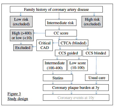 L’étude CAUGHT-CAD visait à démontrer l’utilité du score calcique dans la prise en charge des patients asymptomatiques présentant un risque de maladie coronaire précoce, en raison d’antécédents familiaux de coronaropathie chez un parent au premier degré avant l’âge de 60 ans. Les participants ne devaient pas avoir de dyslipidémie nécessitant un traitement, ne devaient jamais avoir été traités par statines, et devaient avoir un risque cardiovasculaire intermédiaire (estimé par le calculateur de risque australien – l’étude a été en Australie). Un score calcique et un scanner coronaire étaient réalisés à tous les patients, mais les résultats leur étaient initialement inconnus. Les patients avec un score calcique très bas (<10) ou élevé (>400) ont été exclus. Les patients restants ont été répartis aléatoirement en deux groupes :