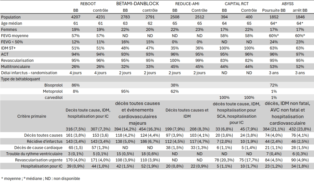 Si tous les essais visent à clarifier le rôle des BB après un IDM avec une FEVG non altérée, ils diffèrent par la précision de leurs fenêtres de randomisation (avant 7 jours pour BETAMI et REDUCE-AMI, avant 14 jours pour les autres), l’exigence ou non d’une revascularisation comme critère d’inclusion (la revascularisation n’était un critère d’inclusion clairement mentionné que dans BETAMI), et la spécificité de leur approche en matière de FEVG (> 50% pour REDUCE-AMI, > 40% pour REBOOT, CAPITAL-RCT et DANBLOCK, supérieure ou égale à 40% pour BETAMI). Néanmoins, les caractéristiques des patients inclus dans les différents essais sont assez proches (voir tableau) de sorte que ces éléments ne semblent pas prépondérants pour expliquer la différence entre BETAMI-DANBLOCK d’une part, et les autres essais d’autre part. De même, la définition de l’IDM comme critère de jugement diverge entre les études (3ème définition pour REBOOT, 4ème définition pour les autres ; tout type d’IDM dans REDUCE-AMI, seulement les IDM de type 1 et 2 dans les autres études), mais il n’est pas certain que ces différences constituent une explication aux différences de résultats.