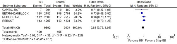 Les auteurs identifient 1.885 patients (âge médian 63 ans, 19% de femmes, 32% d’IDM avec sus-décalage du segment ST, FEVG médiane 45%), soit 13% de la population totale des essais REBOOT, BETAMI-DANBLOCK et CAPITAL-RCT. REDUCE-AMI n’a évidement pas été pris en compte puisque les critères d’inclusions spécifiaient que la FEVG devait être supérieure à 50%. Le metoprolol est utilisé dans 49% des cas, le bisoprolol dans 44% des cas. Le suivi médian est de 3,5 ans. Le critère primaire (décès toutes causes, IDM ou IC) survient chez 106 patients (11%) (32,6 évènements pour 1000 patient-années) dans le groupe BB et chez 129 patients (14%) (43,0 pour 1000 patient-années) dans le groupe contrôle (HR 0,75 ; IC95% 0,58–0,97 ; p=0,031). Les différents composants du critère primaire ne sont pas significativement différents entre les groupes, notamment les IDM, mais on arrive sur un nombre limité d’évènements et l’analyse manque clairement de puissance pour être pertinente. C’est encore plus vrai pour les décès de cause CV pour lesquels la population étudiée ne représente qu’à peine 10% de l’effectif total des essais, en raison de l’absence d’information sur les causes de décès dans BETAMI.