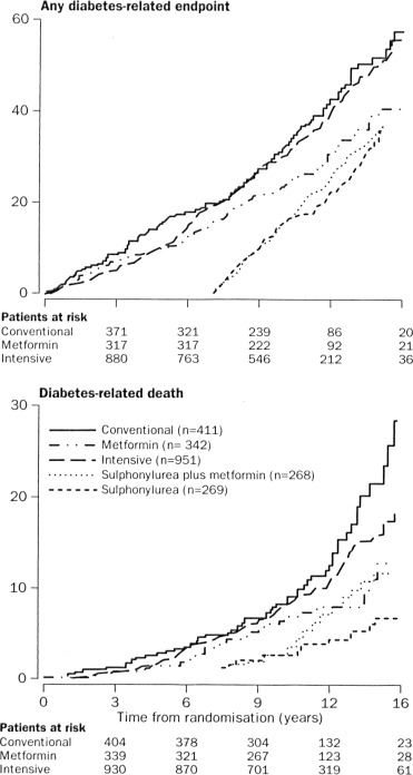 • Une troisième randomisation concernent les patients sous sulfamides dans UKPDS-33 et inclus dans l’un des 15 centres retenus dans UKPDS34, et dont le contrôle glycémique n’est pas optimal (vous suivez ?). Ces patients étaient alors randomisés entre ajout de metformine ou poursuite du sulfamide, ce dernier groupe pouvant quand même se voir adjoindre de la metformine en cas d’hyperglycémie persistante.