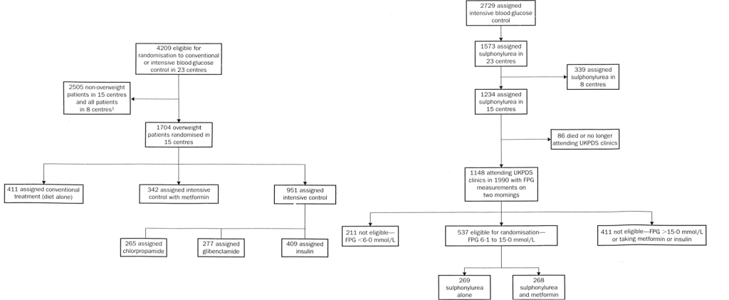 La place de la metformine a été évaluée dans UKPDS-34, publiée en 1998 dans le Lancet. Oui, il y a bien eu 33 autres papiers basés sur UKPDS avant celui sur la metformine ; et il y en a eu beaucoup d’autres après… vous pouvez trouver la liste ici. UKPDS-33, par exemple, comparait traitement par sulfamide ou insuline vs régime seul. En quoi consiste UKPDS-34 : Entre 1977 et 1991, des patients atteints de DT2 nouvellement diagnostiqué, âgés de 25 à 65 ans, présentant deux glycémies à jeun consécutives supérieure à 6,0 mmol/L, ont été invités à suivre un régime riche en glucides et en fibres, pauvre en graisses saturées, avec une restriction énergétique pour les patients en surpoids. Après 3 mois de régime, 4 209 patients éligibles présentant une glycémie à jeun supérieure à 6,0 mmol/L ont été randomisés entre « traitement conventionnel » par régime seul, ou « traitement intensif » par sulfamide hypoglycémiant ou insuline (c’est UKPDS-33), la metformine constituant une option thérapeutique pour les patients en surpoids (c’est UKPDS-34). Mais seulement 15 centre sur les 26 d’UKPDS-33 participent à UKPDS-34. On a donc deux études imbriquées l’une dans l’autre, dont l’une ne concerne qu’une partie des centres ; mais c’est encore trop simple… Car il y a plusieurs randomisations dans UKPDS-34.